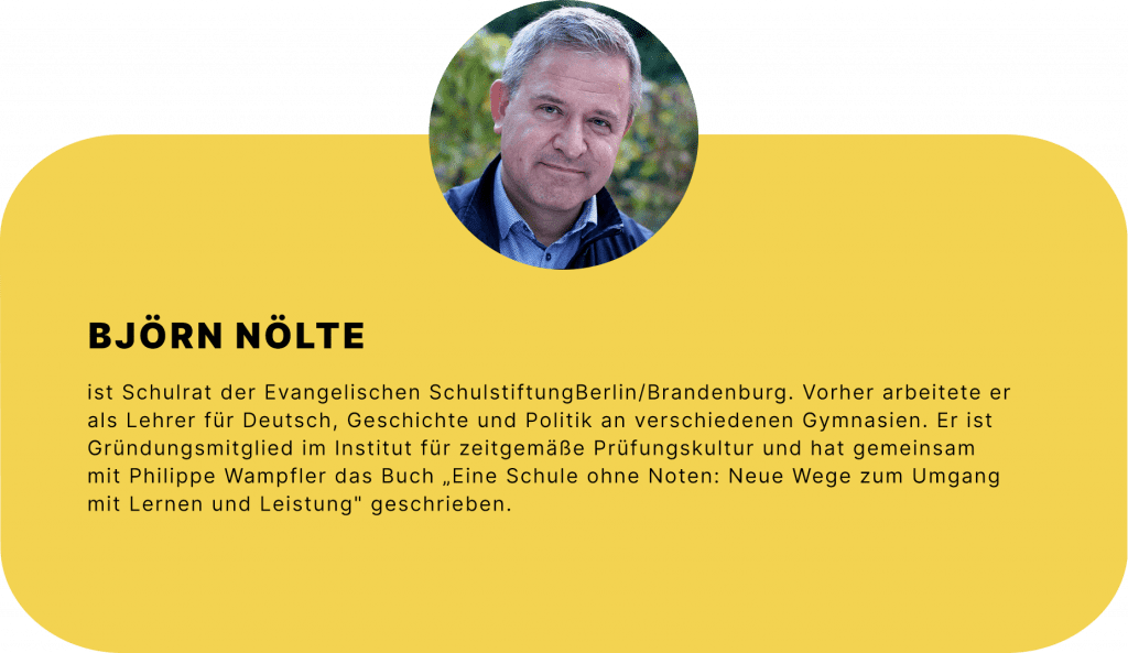 Björn Nölte war lange Jahre Lehrer für Deutsch, Geschichte und Politik. Heute arbeitet er in der Schulaufsicht und ist Gründungsmitglied im Institut für zeitgemäße Prüfungskultur, wo er den Wandel der Schule mit vorantreibt.