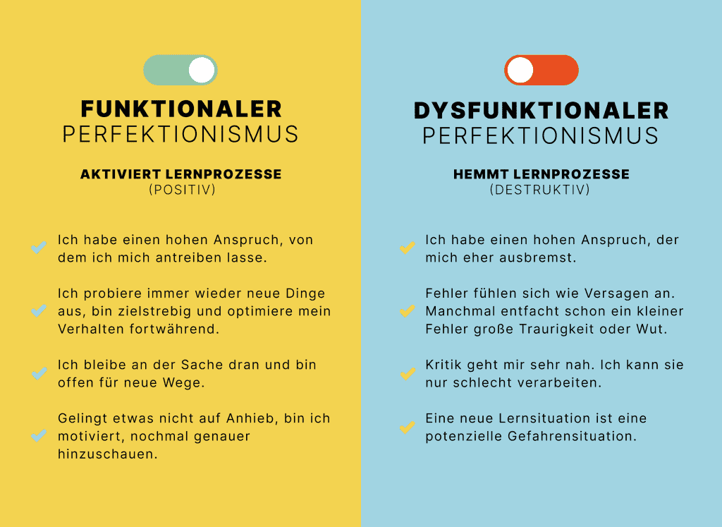 Während Lernprozesse vom funktionalen Perfektionismus angetrieben werden, werden sie vom dysfunktionalen gehemmt. Der dysfunktionale Perfektionismus kann einen Teufelskreis auslösen und sich negativ auf die gesamte Schulzeit auswirken.