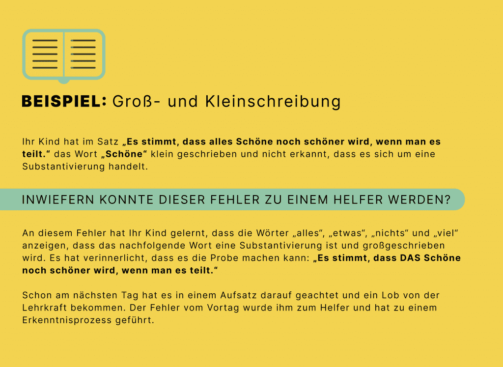 Viele Frusterlebnisse lassen sich bereits im Vorfeld vermeiden. Lernt Ihr Kind Konzentrationstechniken kennen und arbeitet es mit Pausen, macht es beispielsweise weniger Flüchtigkeitsfehler. Kennt es clevere Strategien, um sich auch abstrakten Lernstoff leicht zu merken (z.B. die Locitechnik oder die Körperlistentechnik), vermeidet es die Erfahrung, Merkstoff in der Klassenarbeit nicht abrufen zu können. Es lohnt sich also einen Werkzeugkoffer an cleveren Lernstrategien und -techniken anzulegen.